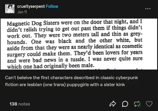 A post by cureltyserpent containing an excerpt from a book. The excerpt reads “Magnetic Dog Sisters were on the door that night, and I didn’t relish trying to get out past them if things didn’t work out. They were two meters tall and thin as greyhounds. One was black and the other white, but aside from that they were as nearly identical as cosmetic surgery could make them. They’d been lovers for years and were bad news in a tussle. I was never quite sure which one had originally been male.”. The poster comments “Can’t beleive [sic] the first characters described in classic cyberpunk fiction are lesbian (one trans) puppygirls with a sister kink”.