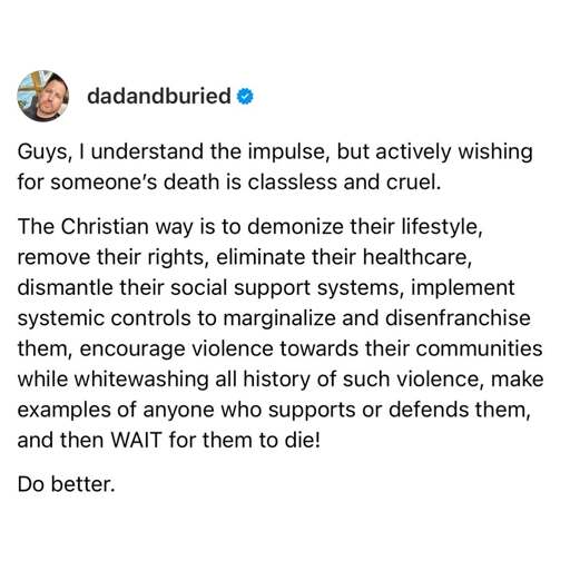 Hi fellow gay! I am doing everything I can to bite my tongue seeing friends and family post the most vile shit praising Charlie Kirk as a “good Christian man”.