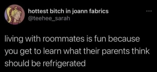 I’ve had roommates where we just ended up buying our own ketchup, mustard, soy sauce, fish sauce, Sriracha, and probably other things I can’t remember because they were weirdos that refrigerated those things. I kept mine in the cupboard, they kept theirs in the fridge.