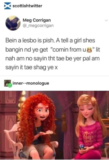 minus-squareZagorath@aussie.zonelinkfedilinkEnglisharrow-up0·2 years agoTo assist: Lesbo: short for lesbian Pish: an expression of frustration Bangin’: hot nd: and ye: you am no: I’m not tae: to yer: your pal: friend shag: have sex with