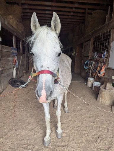 She was easier to catch today, but was a bit nervous leaving the field because we had to walk through the bulk of the herd. The other horses can be nosy as hell and Sandy doesn’t like it when they bother us. They all left us alone though and she settled once we were in the barn. She got treats for being so good for me in the pasture and for being brave.