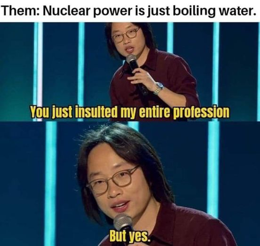 minus-squareneidu3@sh.itjust.workslinkfedilinkEnglisharrow-up1·1 year agoYes. Water + spicy rocks. Everything else is solar power, which is also nuclear power, but with the spiciness in the sky instead.