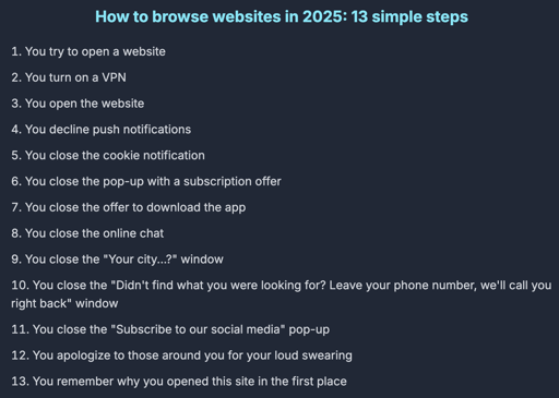 arrow-up13arrow-down1imageHow to browse websites in 2025: 13 simple stepslemmy.mlcm0002@lemmy.world to Programmer Humor@programming.dev · 3 months agomessage-square4linkfedilinkcross-posted to: programmerhumor@lemmy.ml