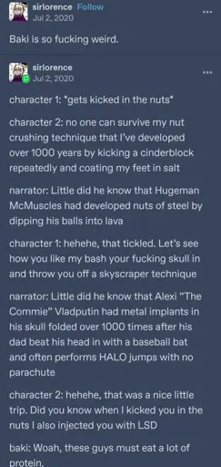 You know you’ve reached the peak of strength when you force your dad to eat your imaginary dinner. This is referencing a real Baki scene.