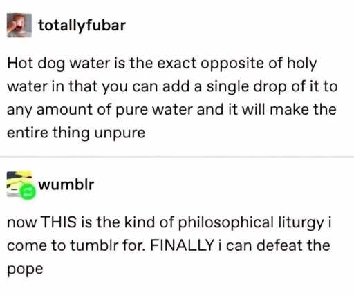 i have a friend that used to work at a hotdog stand in antarctica, and he’d let huge containers of the unholy water freeze outside to carve ice sculptures, igloos and such. sometimes, colonies of penguins pass by and he’ll sell hundreds of thousands of hotdogs, then launch little icebergs of all the frozen waste water. does that make all the oceans tainted?