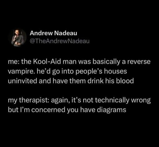 minus-squareFindus_Falke@feddit.orglinkfedilinkEnglisharrow-up10·2 months agolet me picture one of the diagrams: two axies: (drinks blood / gets its blood drunken) × (has to be invited / comes in uninvited) and in the four corners are 1) Vampires 2) Mosquitos 3) Jesus 4) Kool Aid Man