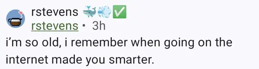 Even before then, I’m not so sure going on the Internet (or any BBS, or ARPANET, or Usenet, or whatever) actually appreciably made anyone smarter. Made us all better at bickering about Star Trek, sure. And better at constructing ASCII cows and pirating software.