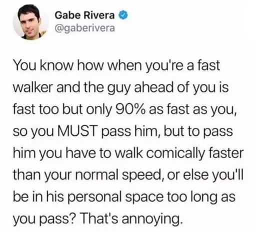 I was in this situation once, I went for the pass, it was taking too long to pass and I noticed they were also speeding up, so I pick up the pace and start the jog and they did the same we started to get into a full sprint. It went on for a while until we got to the corner, he went left and I waited for the light. Never saw him again. To this day I’m not quite sure what happened.