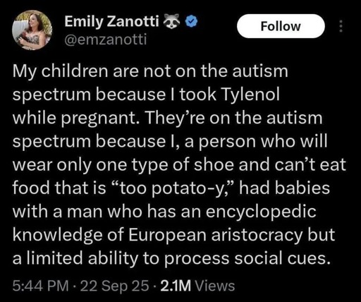 But there’s a special irony in Conservatives fixating on autism as a public health crisis, given that it is literally boiling down to “too many smart people are fucking”, a thing their eugenics-loving elites think we need more of.