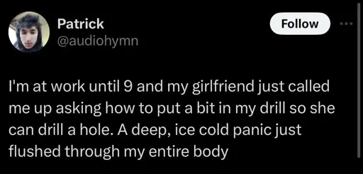 minus-squarebstix@feddit.dklinkfedilinkEnglisharrow-up3·5 days ago just a hammer plaster just came off On the positive side, you now know what a hammer does. If you still want to hang your painting, you should learn what a drill does. Start with a small drill.