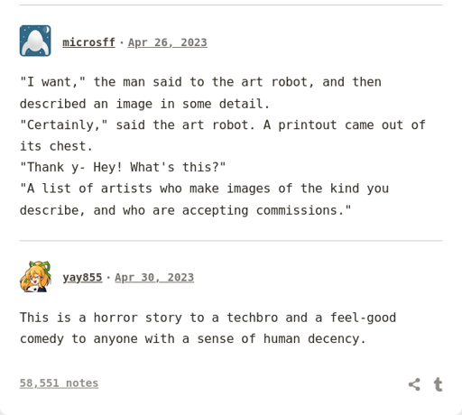 You know, it’s not hard if you don’t think art = anime girls or hyper realism. That’s what it seems like all AI bros think art is, though, so that’s why we so often hear this strange non sequitur.