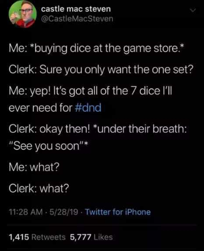 I got by with one set until I started DMing. Ever since then, dice make up about 70% of my carbon footprint.