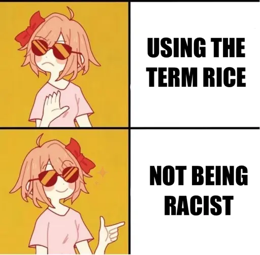 Theres no reason to ever redirect a racist phrase into something positive and completely seperated from its racist past, dispite the community at large already doing that. Words cannot change or evolve, and any word with even an inkling of negativity should be banned from ever being spoken (/s). I specifically called out that rice can be used in a racist and as a borderline slur, but that the modern useage of the word is painfully obviously removed from that connotation: considering the massive amount of people under this post also claiming they have never used, or even knew, the word could at all relate to degrading asians.