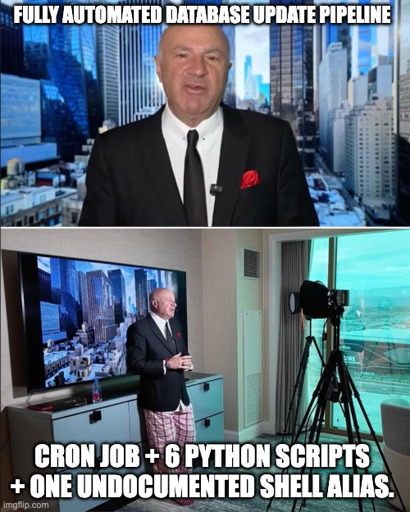 Pipelines are meant to be versioned an replicable, as opposed to a hack job that only runs on a forgotten server in someone’s closet depicted in the meme.