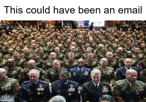 arrow-up1919arrow-down1imageHegseth's pointless meetinglemmy.worldrobocall@lemmy.world to Political Memes@lemmy.world · 4 days agomessage-square100linkfedilink
