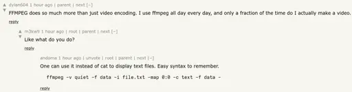 my ass searching up any ffmpeg command every time I wanna run them instead of memorizing it or putting it in a text file to reuse