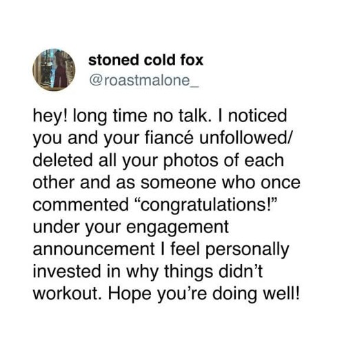 If this were a comment on my social media to answer…well first of all I would have to clarify with them “you must mean my second broken engagement, right? The first one happened before Facebook, back in 2005, but we had MySpace then I think, but still, you mean 2024?”.