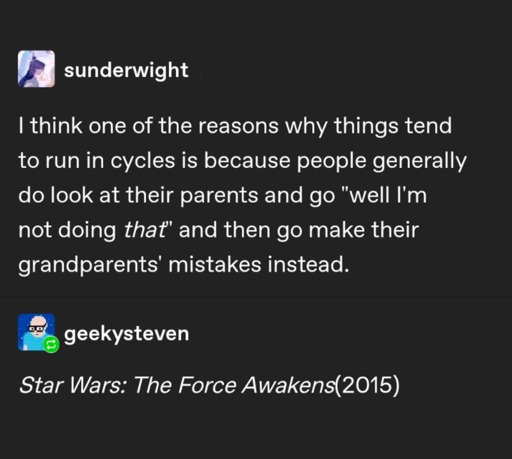 It’s pithy, but I tend to see a broader materialist cycle at work. Folks who say “I’m not going to make the mistakes my parents made” tend to be class-mobile and dealing with conditions their parents didn’t necessarily face.