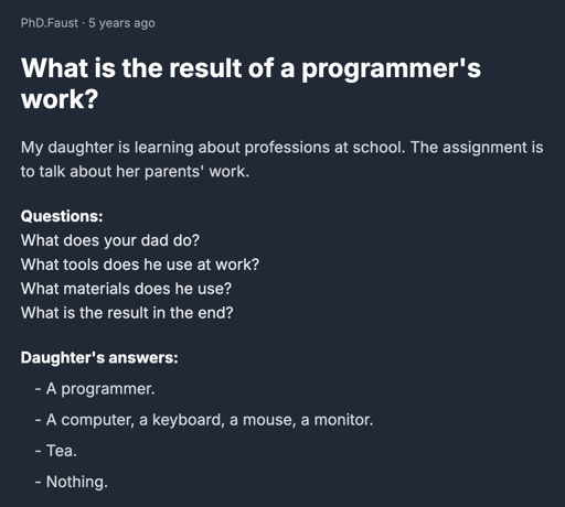 ☆ Yσɠƚԋσʂ ☆@lemmy.ml to Programmer Humor@lemmy.mlEnglish · 22 days agoWhat is the result of a programmer's work?lemmy.mlimagemessage-square3linkfedilinkarrow-up194arrow-down12cross-posted to: programmer_humor@programming.dev