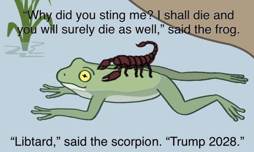 I was literally going to reply to this pointing out that “protest voters” fit better as the scorpion than MAGA people. The MAGA people didn’t know that Trump was an objective disaster. They just thought he would make a disaster for their enemies and leave them alone. The “I’m too left for Kamala” people did know, and they still decided Trump wasn’t worth resisting, because they wanted to make their point. Or, as the scorpion said, it’s in their nature, and they just felt really strongly that that’s what they wanted to do.
