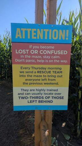 The sign is a joke, because you can just walk through the corn in any direction to leave the maze. This is, however, discouraged. (The mazes usually are for the whole family and not particularly hard in the first place.)