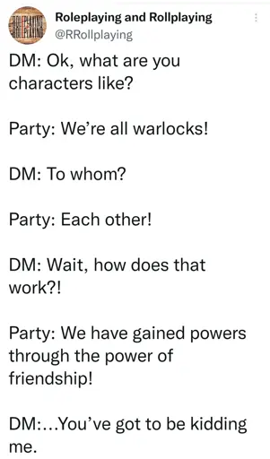 I have been working on a scenario setup based on a previous posting of this idea. MLM, multi-level magicking. Boil-down is that the party is a group of newbie mages (warlocks in DnD terms) at one or more of the local ‘Mages guilds,’ (which guild is determined by subclass) organizations which send out Mages to ‘help’ in one way or another. Some of the work is paid, but plenty of it is pro bono publica. The guilds have a great reputation because of the pro bono work, so PCs start with a very high-fantasy power rangers feel, but they got their powers by entering a magical loyalty contract to their ‘Mentor,’ and some of the jobs they get sent on will seem kind of ‘…off’ compared to the others, and they find out the only way to become more powerful (literally to gain levels, XP is meaningless/capped) is to find their Mentor’s Mentor and take their Mentor’s place, removing their Mentor’s power, which their mentor doesn’t want. So the party slowly gets to see that only the sneakiest, most conniving and underhanded Mages are able to advance, but now they have to either advance, or quit and become commoners.