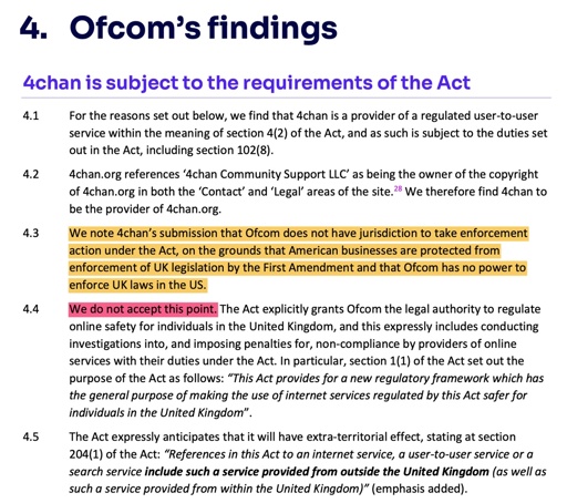 - USians are surprised that they must follow the foreign law if they do business (generate income) outside of the USA. - And the guy writing this blog is a fucking utter idiot. - Im going to take a charitable read on this and just assume that you’re misunderstanding or uninformed of the context at the core of this, because nothing of what you said is really applicable. - Read again than. - The fucking US idiot writing this blog is surprised that 4chan must follow UK law while having customers/users in the UK. - Which part is not applicable? - The part where they have any infrastructure, operations, revenue, or presence at all in the UK. They don’t, so the UK doesn’t have jurisdiction. This isn’t like the Apple stuff, where physical Apple products are being sold at retail in the EU/UK. UK residents are intentionally navigating to a website outside UK jurisdiction. If a UK resident goes to Mallorca on holiday, Spanish laws, not UK laws, apply because they’re in fucking Spain. - Also you should probably click that About page on the linked blog dude. Unless some American just randomly wound up at UCL in 1988 then graduated, stayed in the UK, and got a job at UCW Aberystwyth, you might want to rethink the random bullshit you’re spouting off as fact lol. By all means keep going off about how British ppl are “USians” and “US idiots” though. - I feel like I am missing something reading your comments, but it seems pretty clear to me that they do do business in the UK. They have users in the UK, to which they are providing a service (the 4chan message boards) in exchange for eyes on adverts placed on the page (from which 4chan makes money). - Just because this law is really stupid, and that 4chan does not have servers in the UK doesn’t really matter. UK laws can still be enforced for individuals in the UK (which is expressly what is stated in the message from ofcom). Ofcom is not demanding that age verification is implemented for all users world wide, but for UK users. 4Chan can decide to not comply (which I think is good), but then it is not surprising that if you keep doing business in the UK (not blocking UK users/IPs) that fines (which 4chan will just ignore as they are not UK based) and possible bans on your service in the UK follow. - So as I understand it from conversations surrounding the USB-C stuff and other things the EU was trying to enforce on US headquartered companies, “doing business in” means the company has a registered subsidiary in that region, they have local payment processors, etc. So Meta does business in the EU or UK because they sell advertising space to businesses in those regions that target users in those regions, and the ad fees are paid to that local subsidiary through local payment processors. - Ofcom is not demanding that age verification is implemented for all users world wide, but for UK users. 4Chan can decide to not comply (which I think is good), but then it is not surprising that if you keep doing business in the UK (not blocking UK users/IPs) that fines (which 4chan will just ignore as they are not UK based) and possible bans on your service in the UK follow. - I think we’re on the same page. Ofcom can’t force 4chan to do anything, because they don’t have jurisdiction over 4chan. They can’t force 4chan to implement age verification, or to implement geoblocks. They can issue fines if they feel like it, but they’re uncollectible. - So ultimately that’s what’s so ridiculous and goofy and annoying about all this shit. Ofcom is acting like foreign companies with no business operations in the UK are subject to its decisions. They are not. Ofcom should have never tried regulating entities it has no authority over, it just makes them look silly and naive. - The UK has every right to restrict their own residents access to things that are illegal internally. Just like how they have customs controls at their physical borders to prevent illegal physical items from being imported, they should have just blocked 4chan off the rip instead of trying to fine them. - They can’t force 4chan to implement age verification, or to implement geoblocks. They can issue fines if they feel like it, but they’re uncollectible. - The UK has every right to restrict their own residents access to things that are illegal internally. Just like how they have customs controls at their physical borders to prevent illegal physical items from being imported, they should have just blocked 4chan off the rip instead of trying to fine them. - Yeah, reading this I think we are indeed on the same page.
