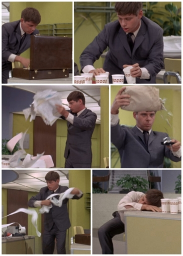 It’s a scene from the film How To Succeed in Business Without Really Trying where the main character tries to make it look like he’s been working all night, right before the CEO walks through the door.