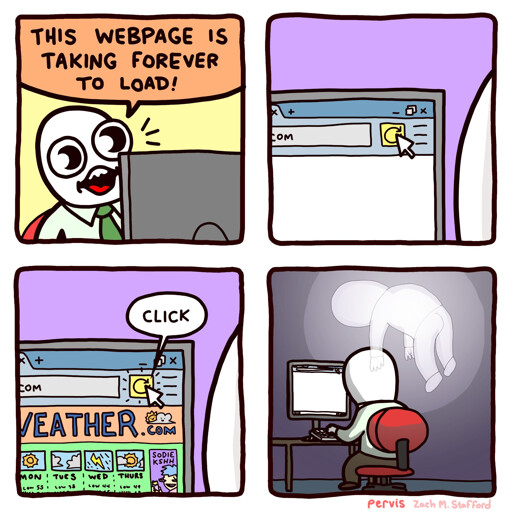 Pervis: THIS WEBPAGE IS TAKING FOREVER TO LOAD! Pervis clicks refresh button the same instant the page loads CLICK Pervis’s spirit departs the body