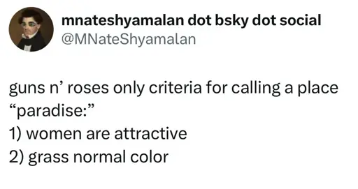 Honestly probably the most historical take on what makes a place paradise. Slash would be right at home in the early days of man, making fertility idols.