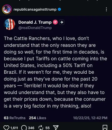 Florencia (she/her)@lemmy.blahaj.zone to Progressive Politics@lemmy.worldEnglish · 7 days agoStop bitching ranchers. Y'all starting to sound like a bunch of libslemmy.blahaj.zoneimagemessage-square23linkfedilinkarrow-up1362arrow-down16