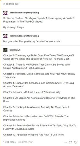 But that basically gets us to, what, blunderbusses? Or maybe something even less functional, I’m no historian. Point being that, in a world with magic, innovating on a boomstick that has an effective range of ten meters may not be an attractive use of time when you have other, better options.