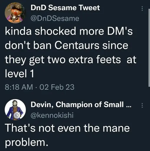 For some reason any time I have ever brought up playing a centaur, every DM always shoots it down either saying its a serious campaign or it doesn’t fit the vibe.