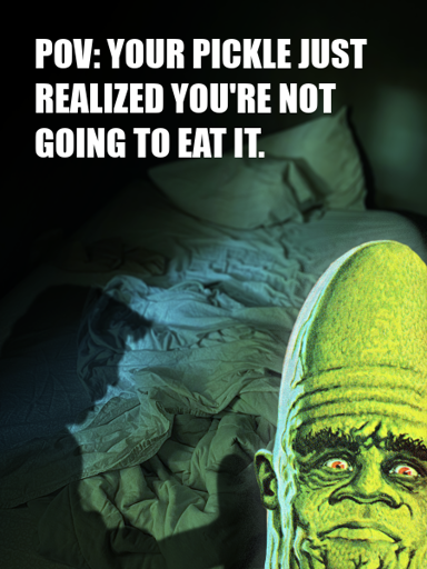 Where’s the naked person bending over? Who just tosses a pickle in bed for no reason?