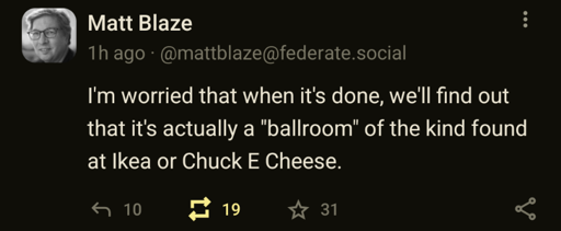 minus-squareMarty@lemmy.worldlinkfedilinkarrow-up2arrow-down1·7 days ago“I always fill my ballroom, the event is never small. The social pages say I’ve got the biggest balls of all”