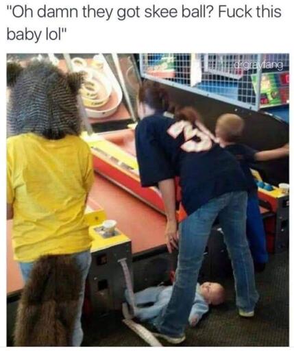 Alright, I’ll bite. That baby is perfectly fine and probably enjoying watching their mom Do Things (babies love this for some reason). Obviously not the safest being where you could drop a skeeball on them, but Mom is very aware of that I’m sure. Laying face up on the ground is actually safer than trying to precariously hold them and risking dropping them.