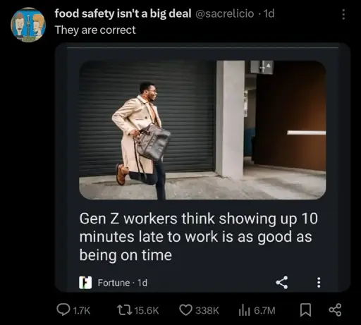 Exactly. It also matters what type of shift work. If you’re late to a hospital nursing shift, that sucks because you can’t do the changeover stuff and they’ve been there 12 hours. Or if you’re the only one taking phone calls in the morning or something. In sane a world, there would be room for decent folks as well as folks who are always on time.