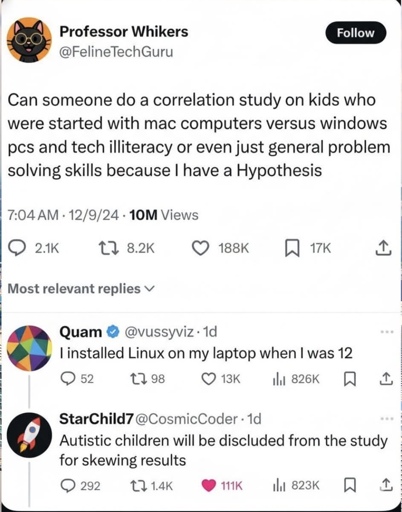 If you’re using Lemmy there’s a good chance you’ll be excluded from the study. Some of the largest Lemmy communities are Linux related.