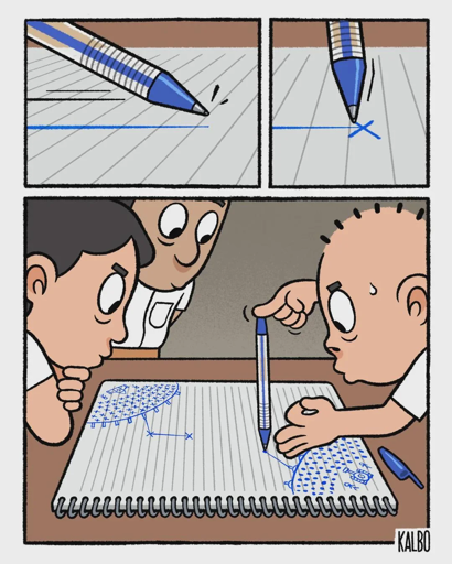 Two players draw their battalions on opposite corners of the paper, both with the same number of outward facing tanks. Player 1 places a pen on one of their tanks and then an index finger on top, like you see in the comic. You then flick the pen and try to get it in the other player’s ass. However far it gets, you mark the end and then it’s the other player’s turn.