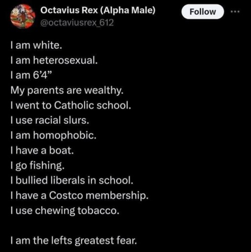 that is the cliche of a manchild. they are so insecure that they constantly have to emphasize who they are and how unapoligetic they flaunt their uselessness. people fear them, because trump showed how awful these pampered toddlers in suits compensate their absolute impotence by making everyones life more miserable. they don’t fear him, but his tantrums. such people werent raised properly and have turned into antisocial bastards and a burden on society. the epitome of a parasite.