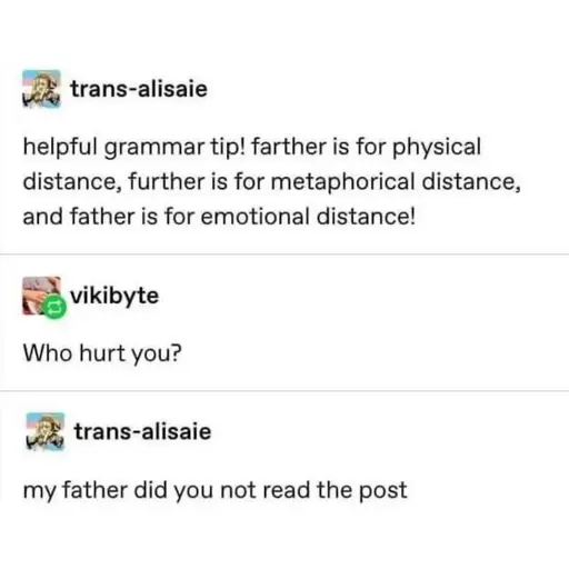 trans-alisaie: helpful grammar tip! farther is for physical distance, further is for metaphorical distance, and father is for emotional distance!