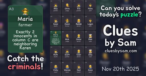 I solved the daily Clues by Sam, Nov 18th 2025 (Medium), in less than 7 minutes 🟩🟩🟩🟩 🟩🟩🟩🟩 🟩🟩🟩🟩 🟩🟩🟩🟩 🟩🟩🟩🟩 https://cluesbysam.com/