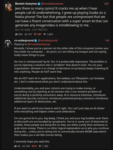 arrow-up11.09Karrow-down1imageThe CEO of Microsoft AI is unimpressed by the negative criticism of Windows AI.lemmy.nzLee Duna@lemmy.nz to Fuck AI@lemmy.worldEnglish · 21 days agomessage-square94linkfedilink