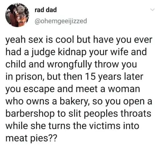 minus-squarecannedtuna@lemmy.worldlinkfedilinkarrow-up36arrow-down1·23 days agoI mean… that’s probably a matter of perspective. You should watch the movie rendition, it’s fantastic and Johnny Depp stars in it.