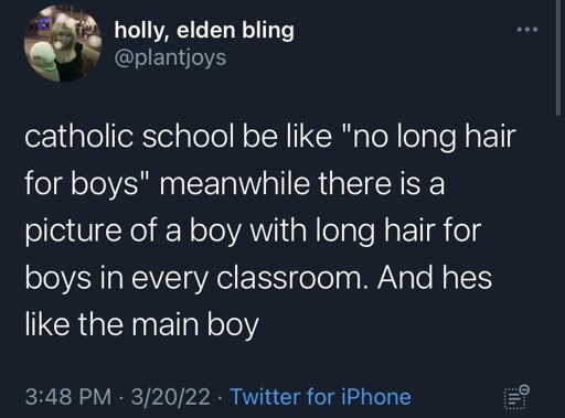My grandmother (may she rest easy), an amazing and sweet woman, but incredibly Catholic, once told me “boys shouldn’t have long hair.” I told her that the Jesus she worships had long hair. Still feel a little guilty about it, but it had to be said.