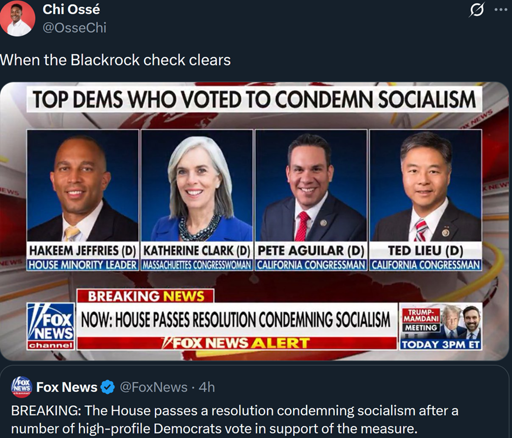 geneva_convenience@lemmy.ml to Progressive Politics@lemmy.world · 6 days agoHakeem Jeffries and other Democrats vote with Republicans to condemn socialismlemmy.mlimagemessage-square36linkfedilinkarrow-up1287arrow-down16