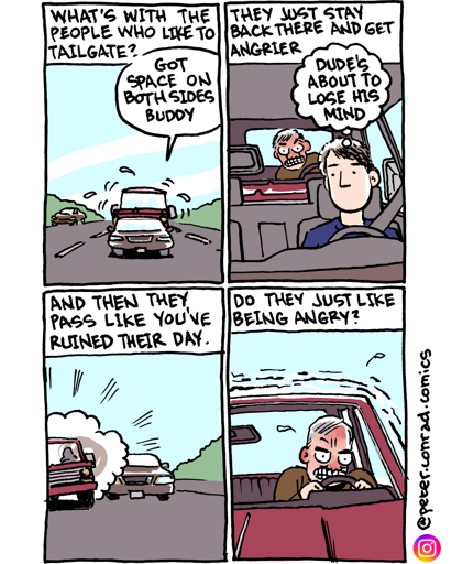 They tailgate because they are actually incapable of maintaining a following distance (you know the kind, when the road is empty they alternate between mashing the gas and driving well under the speed limit, and somehow if you’re a passenger they’re totally unaware that they are doing it even if they are not distracted, how it is possible to be this bad at gauging speed and distance I do not understand but these people do exist).