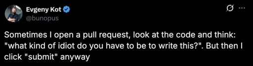 I’m kind of bummed no one at my job really does code reviews seriously. I don’t really get any feedback, so it’s hard to improve.