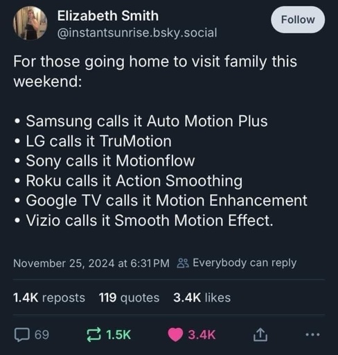 To make matters worse, all TV brands have their own name for this feature. This post is saying that when you go home for the holidays, this is the name of the motion smoothing in the settings to turn off for a better viewing experience the way the filmmaker intends.