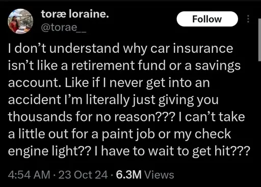 That’s the idea, no one knows if they will get in an auto accident. Most people cant absorb the cost of the ramifications. Instead of every person saving the full amount to replace their car, pay for hospital stays, make someone else whole (which is a ton of money out of the economy and you know for sure a lot of people wouldn’t be responsible enough to do that) we recognize that the number of people exposed to being in an accident is less than the number of people that will be in an accident.
